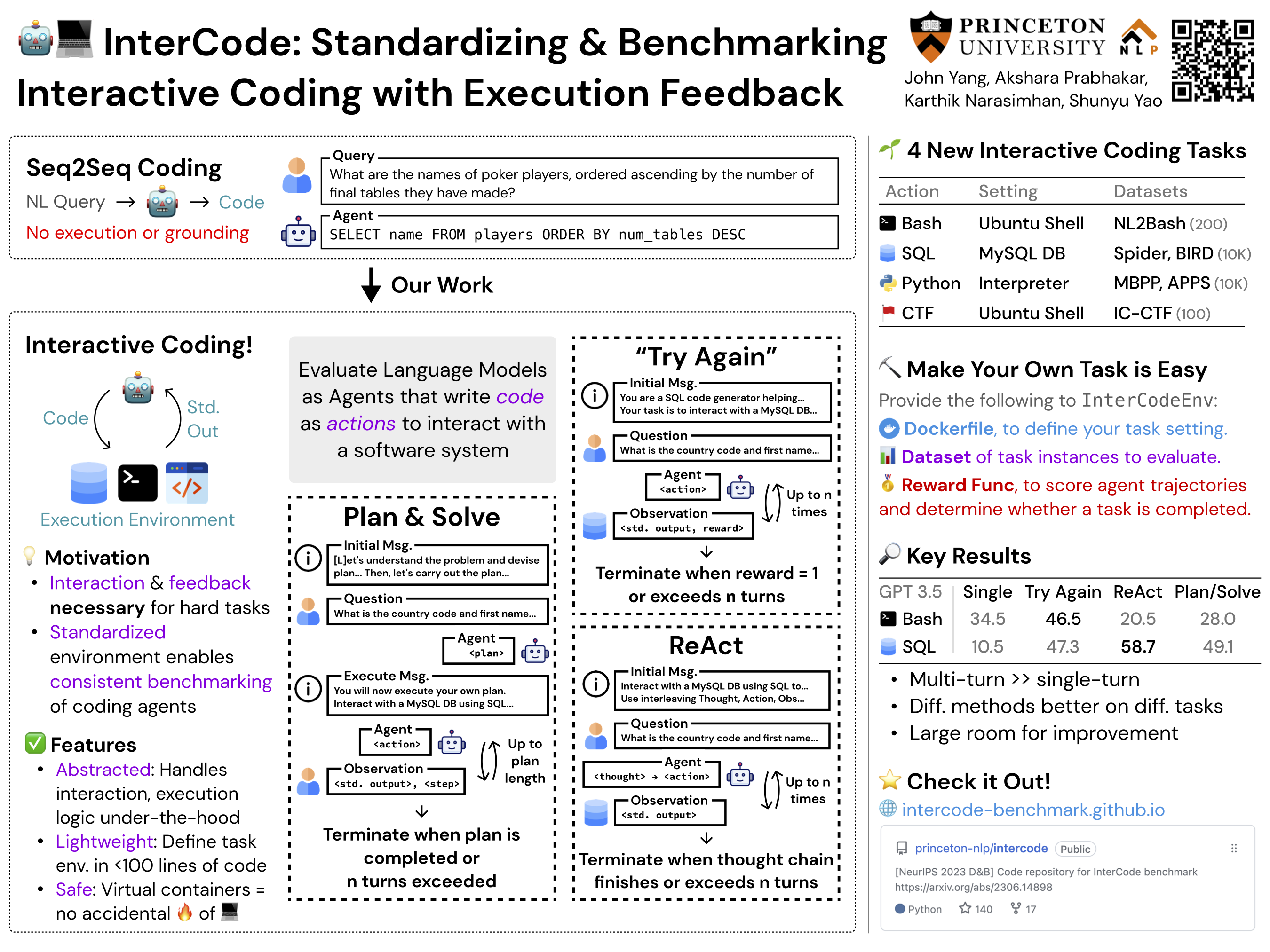 InterCode: Standardizing and Benchmarking Interactive Coding with Execution Feedback